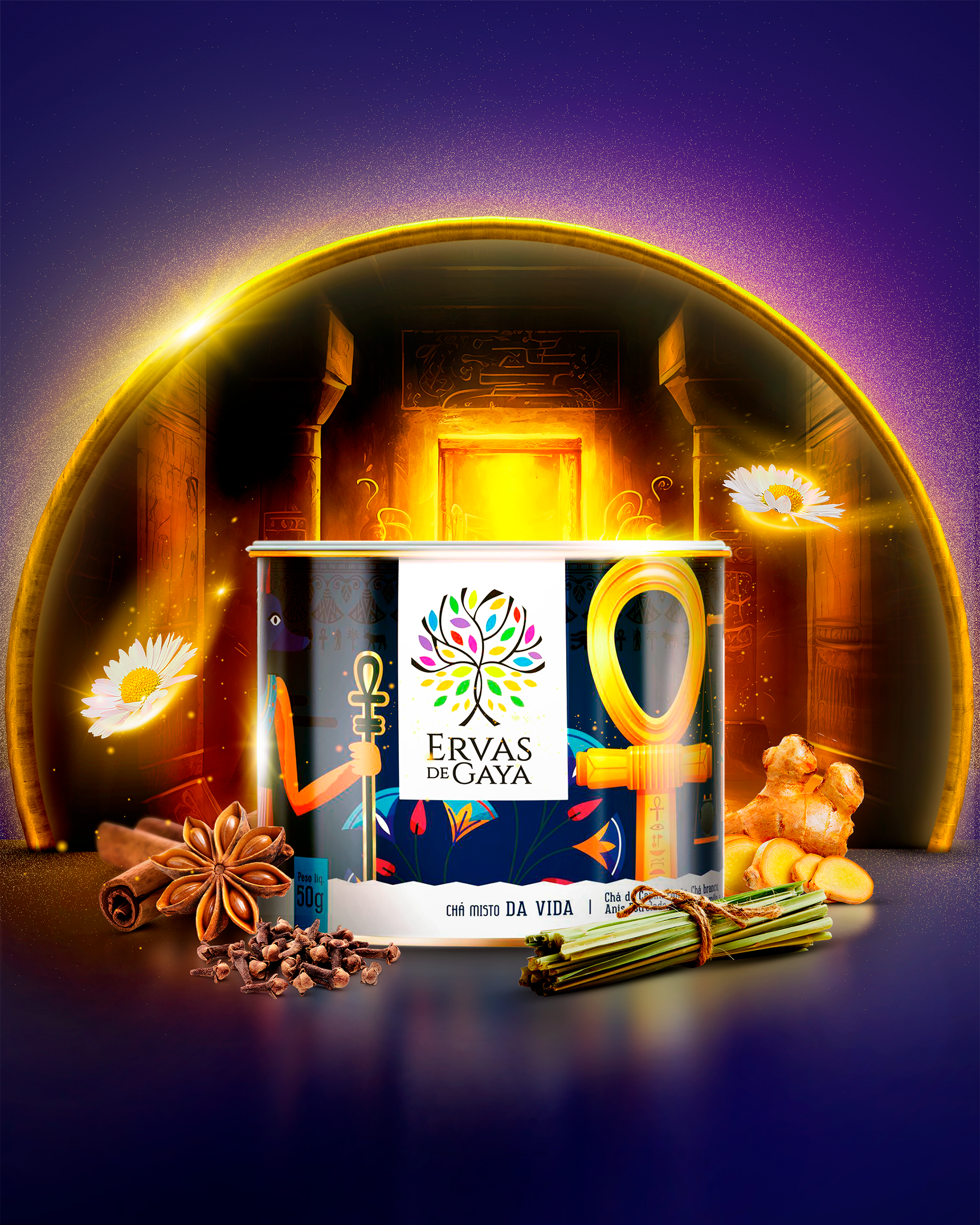 A composição explorou referências visuais que remetem à ancestralidade e ao poder das ervas, criando uma atmosfera luminosa e envolvente capaz de gerar conexão emocional com o público. A peça foi pensada para social media, campanhas digitais e materiais promocionais, ampliando a presença da Ervas de Gaya e fortalecendo a percepção do Chá da Vida como uma experiência sensorial e transformadora.